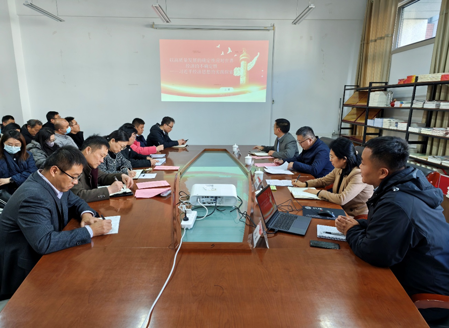 为深入学习贯彻习近平经济思想,助力广大教师精准把握经济发展规律,提升理论素养与实践能力,12月3日下午,球友会在薛城校区豁然楼A315会议室举办了学科交叉学术沙龙暨习近平经济思想研讨会。校党委副书记丰雷莅临指导,学院党委副书记、院长董嫱嫱主持会议。